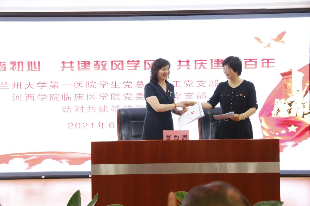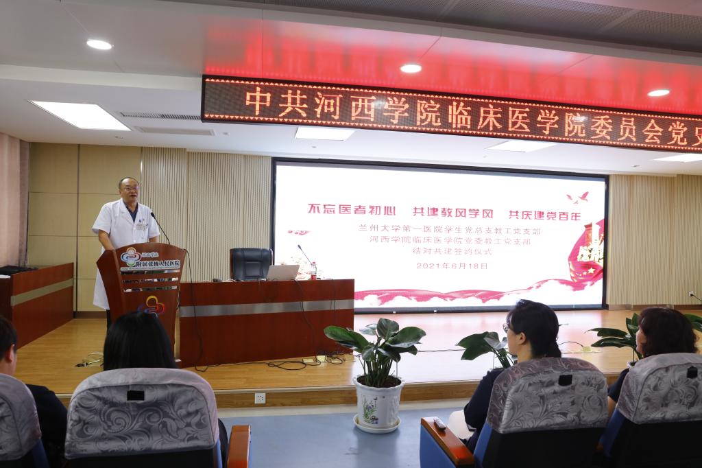 为迎接建党百年,深入学习习近平新时代中国特色社会主义思想,全面贯彻落实党的十九大和十九届二中、三中、四中、五中全会精神,落实新时代党的卫生与健康工作方针,不断巩固深化“不忘初心、牢记使命”主题教育成果,创新基层党建工作载体、提高基层党建工作水平。2021年6月18日,公司党委教工党支部与兰州大学第一医院员工党总支教工党支部结对共建,进行了以“不忘医者初心,共建教风学风,同庆建党百年”为主题的共建签约仪式。公司领导班子成员、教工党支部书记、各教研室主任、教师员工代表及兰大一院副经理、教工党支部书记一行,150多人共同参加了活动。