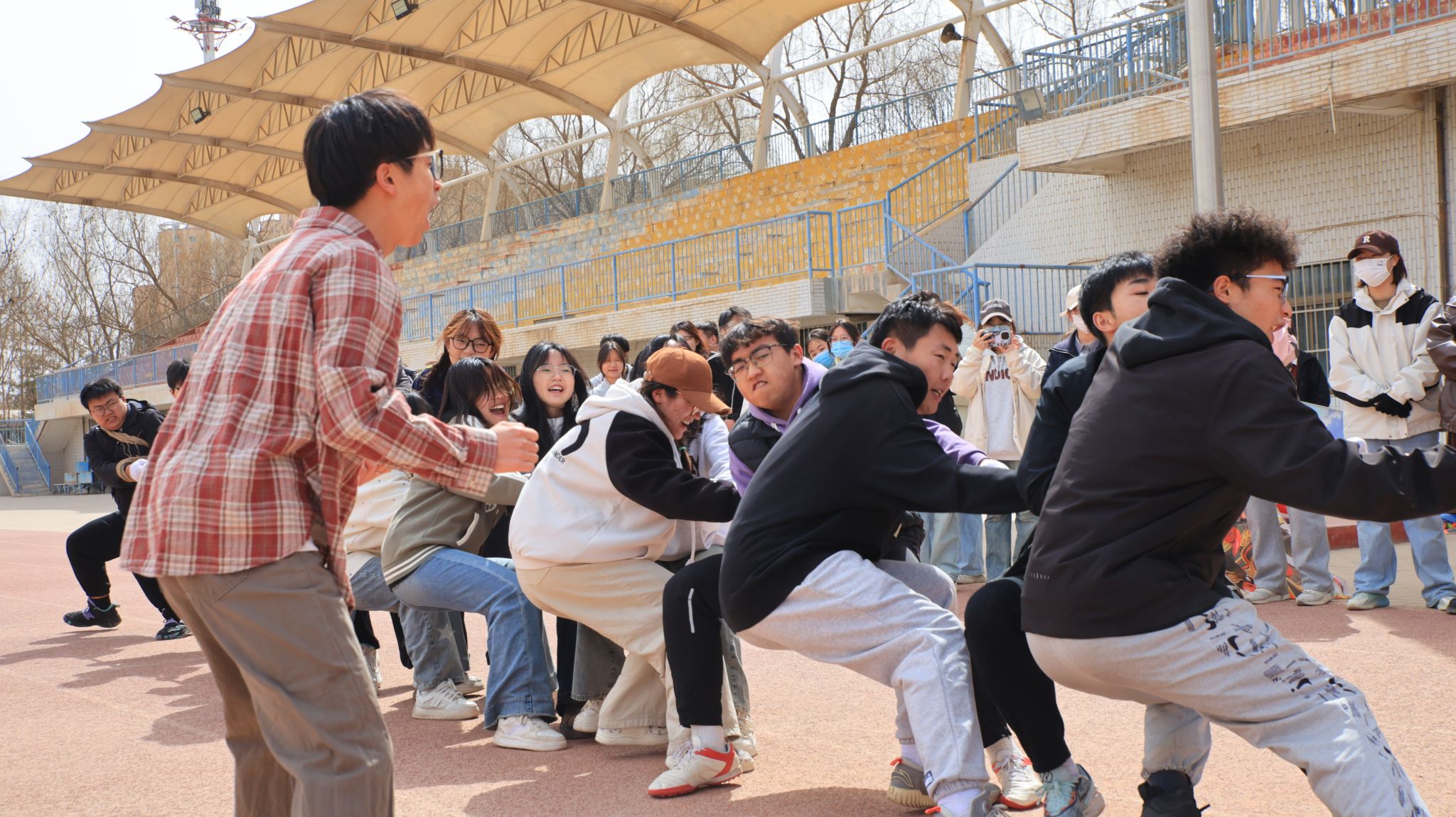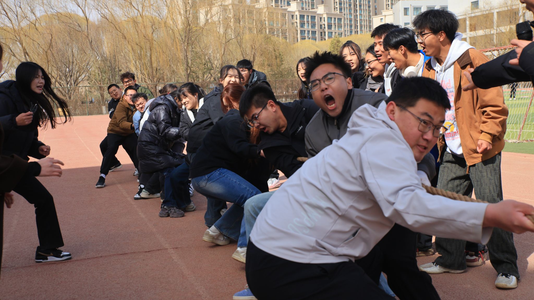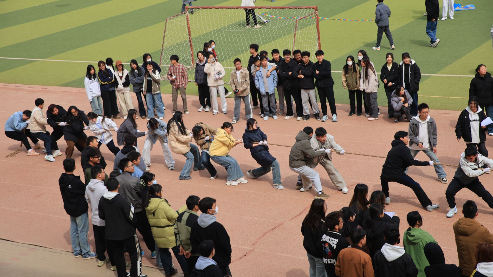 在比赛过程中,参赛选手们精神抖擞,蓄势待发。随着裁判的一声哨响,参赛者们手握麻绳,重心下沉,齐声呐喊,用自己的每一寸力气向着观众们展示团队的凝聚力。观众们在一旁挥舞呐喊,为自己的班级助力。比赛现场气氛紧张激烈,绳索在双方队伍之间你来我往,互不相让,似在争夺那份荣耀。每一声加油似乎给参赛者们注入了无尽的力量,即便汗水打湿了衣衫,他们也仍不退宿,助威呐喊声响彻云霄将比赛气氛推向了一个又一个高潮。经过多轮角逐,临本235班凭借出色的团队协作和顽强的凝聚力,一路过关斩将,最终获得了冠军。