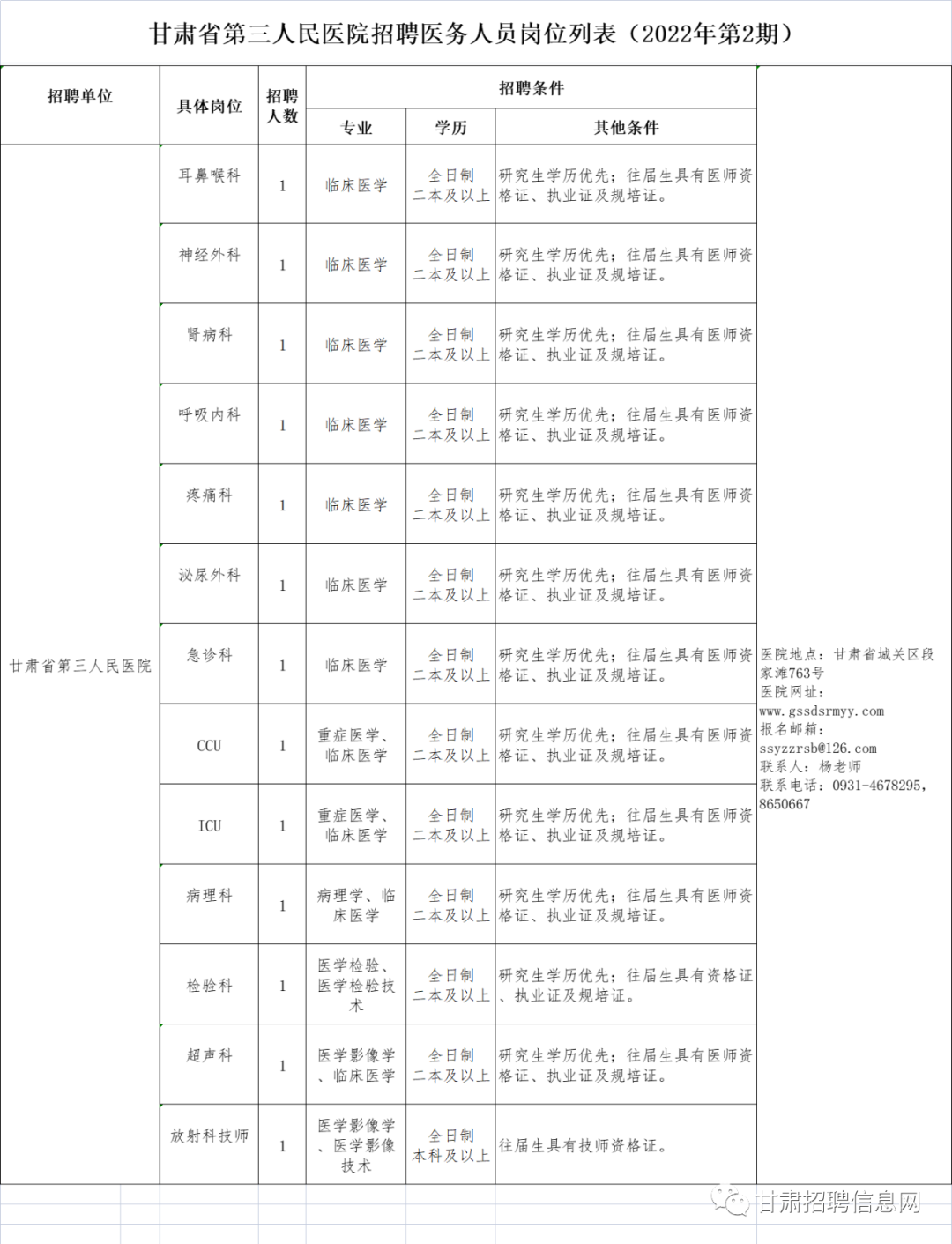 1.甘肃省第三人民医院招聘医务人员岗位列表(2022年第2期)